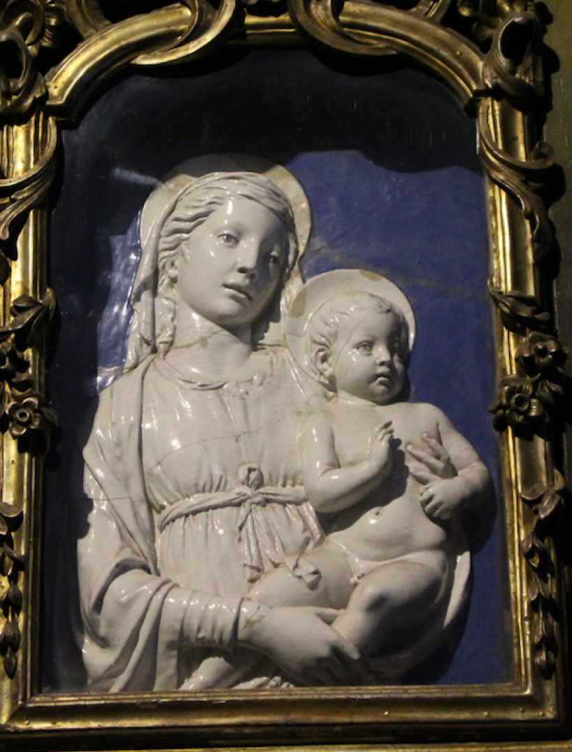 The Della Robbia workshop found another use for blue in their pioneering technique of glazed terracotta. As this Madonna and Child relief below demonstrates, they almost always moved blue from Mary’s mantle to the back of the relief, replacing her drapery and the entire figure with white. Here, the blue ground evokes notions of an open, heavenly sky. At the same time, the blue’s pairing with white relief figures also alludes to expensive ancient cameos carved from precious gems, which were avidly collected by fifteenth-century artists and merchants.